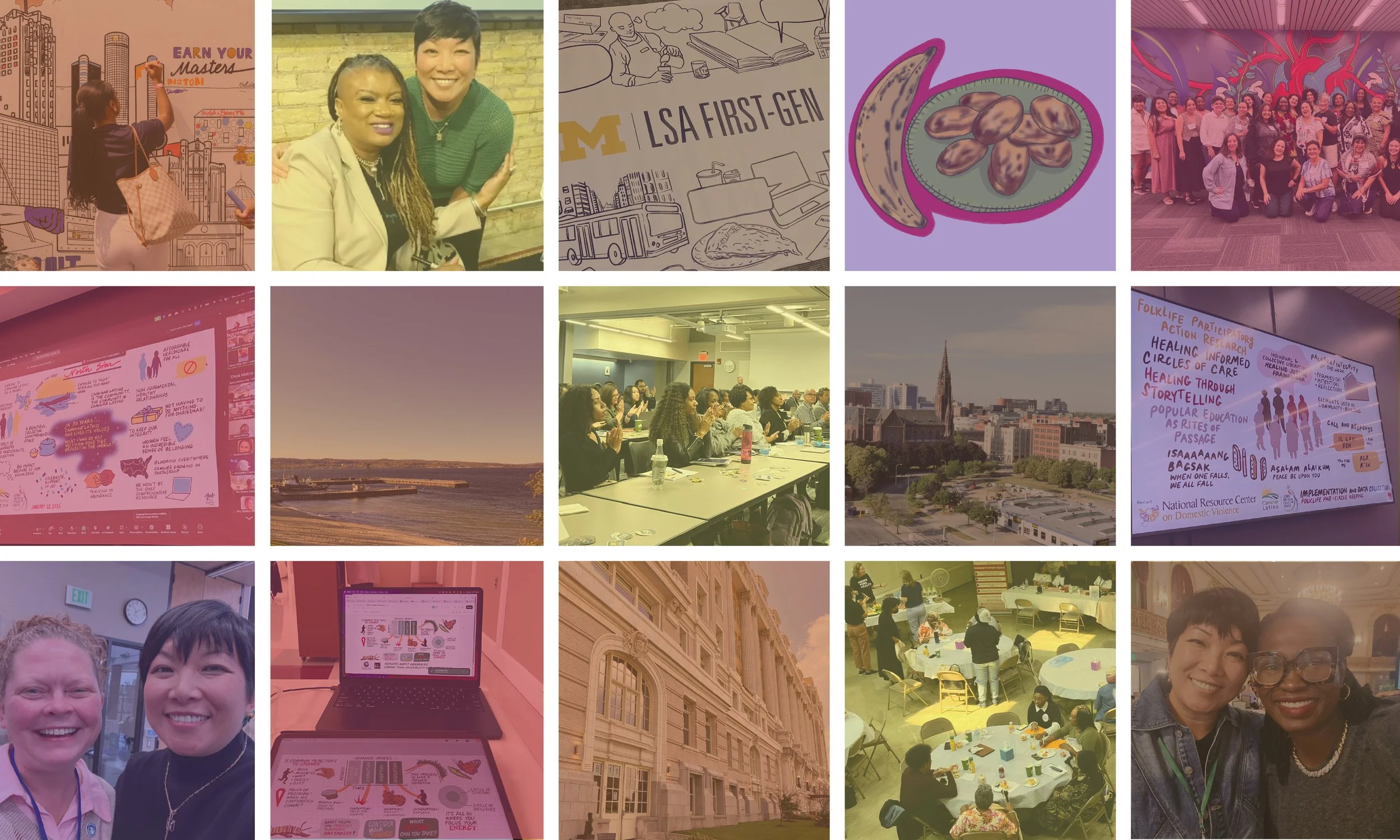 Photo description of blocks above: public art, laptop and digital screens, conferences and convenings around health and education, exterior images of Traverse City, Michigan; Chicago, Illinois; Buffalo, New York; and illustrations and graphic recordings — all images and work, courtesy Yen Azzaro.